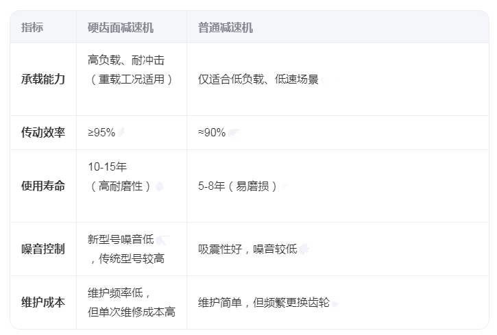 硬齒面減速機與普通減速機(通常指軟齒面減速機)的核心區(qū)別主要體現(xiàn)在齒輪材料、工藝、性能及應(yīng)用場景等方面,具體差異如下: